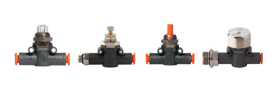 Stosując złącza funkcyjne rodziny LINE ON LINE można zrealizować wszystkie funkcje pneumatyczne w dowolnym miejscu układu, a trwałe oznakowanie korpusu symbolem pełnionej funkcji i kierunkiem przepływu ułatwia identyfikację i montaż.